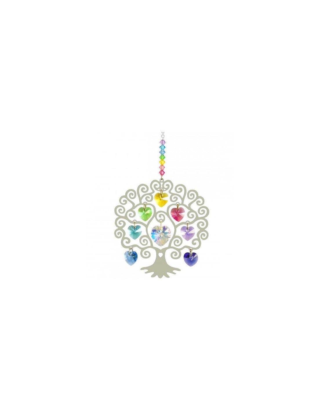 El árbol de la vida es un arquetipo universal que simboliza la unión del cielo y la tierra y manifiesta sabiduría, conexión y regeneración. Decorado con cristales de colores suaves y luminosos, aporta un toque de alegría y ternura.
